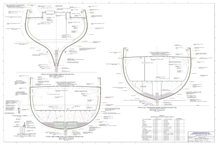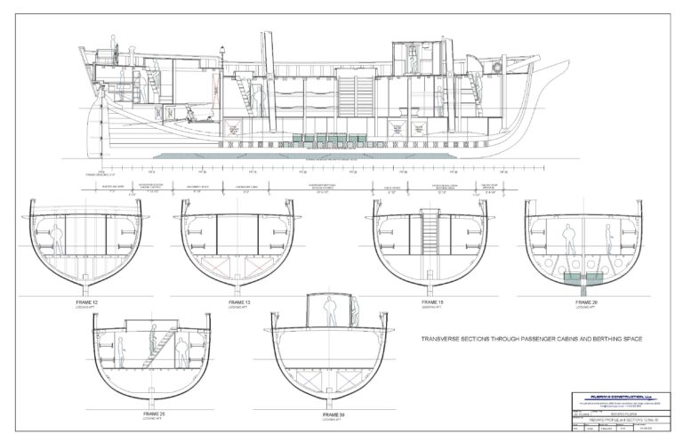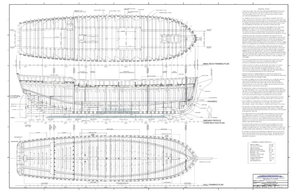 The ship will be constructed and framed in much the same way as the original PILGRIM of 1825. New England shipbuilding in the early 19th century was based on an extension of the accumulated naval architecture and construction knowledge of the great shipbuilders – Spanish, Dutch, French and English – of the preceding centuries plus access to the abundant natural materials resources in the new world, with a good dose of Yankee entrepreneurialism thrown in for good measure. The hull and deck framing system adopted for PIII follows the traditional pattern: closely spaced transverse sawn hull frames on a stiff backbone structure, longitudinal stringers at the bilges and longitudinal deck shelves and clamps at the deck line to maintain framing alignment and contribute to hull sectional modulus stiffness. Completing the primary framing system; transverse deck beams with logitudinal carlins and a system of hanging/lodging/standing knees (brackets) for torsional stiffness. The materials chosen for each of the elements of the framing system match closely in characteristics of grain structure, weight, strength and stiffness as was used in the original PILGRIM – only sourced from further afield in acknowledgement of 200 years of consumption and taking advantage of strictly sustainable resources wherever possible.