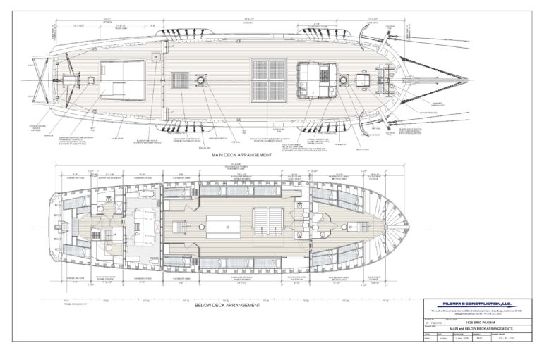 The Sailing School Vessel certification sought from the US Coast Guard implies a high lavel of safety and security built in to the design and construction of the ship. The design of PIII incorporates these elements without compromising the important aesthetic and operational characteristics of the original PILGRIM to be incorporated in the re-creation. In operation PIII is designed and will be constructed with an authentic sailing experience as the ultimate goal of the project.