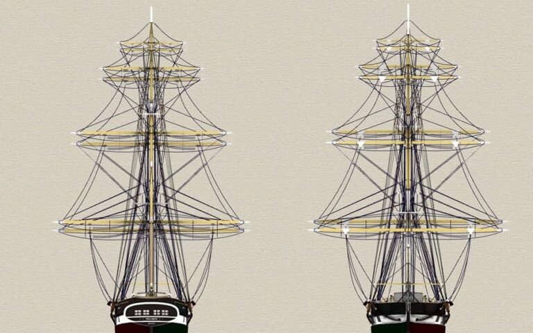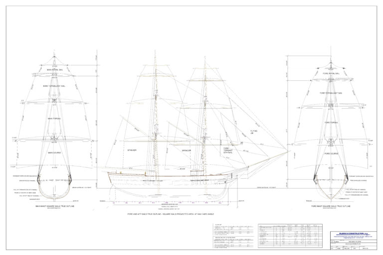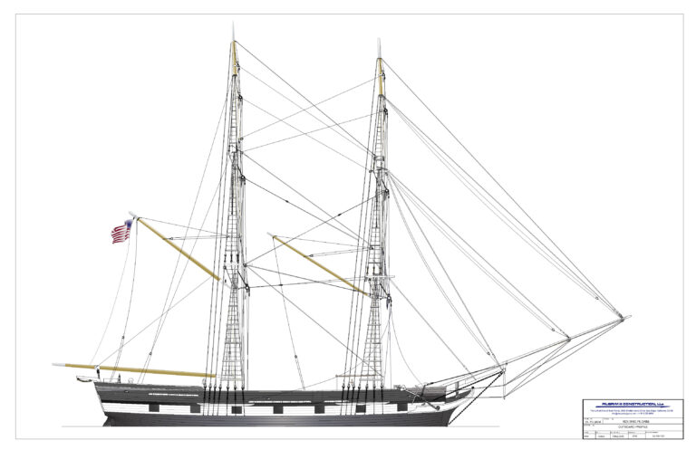 The PIII sailplan is of a typical small brig of the era of the original PILGRIM with all rig proportions true to the historical record. However, in the modern era PIII is bound to certain regulatory safety and stability requirements that will be met through the use of careful blending of the hull design with external and internal ballasting systems plus utilization of lighter, stiffer, stronger and longer lasting materials for the spars, standing and running rigging.